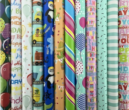 Assortiment van vijf rollen cadeaupapier voor kinderen.