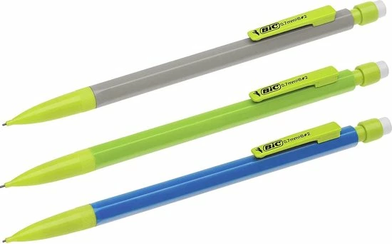 Het BIC Matic ECOlutions mechanische potlood wordt voor 65% gemaakt uit gerecyclede materialen. Een goed voorbeeld van BIC’s inzet om het milieu te beschermen met milieuvriendelijke producten. Sterker nog, BIC is de ecologische voetafdruk van zijn pennen en potloden aan het verkleinen; tijdens het productieproces en door de levensduur te verlengen. Dit mechanische potlood wordt geleverd met 4 HB-stiften (0,7 mm breed/9 cm lang) die soepel en donker schrijven. Precies goed: niet te dun, niet te dik. Ze zijn stevig genoeg voor alle schrijftaken. Deze mechanische potloden zijn ideaal voor het maken van notities en tekenen en ook perfect voor sudoku en kruiswoordpuzzels. Deze mechanische potloden gaan lang mee omdat de groene clip aan notitieboeken, -blokken en zakken gehaakt kan worden, zodat je altijd klaar bent voor de volgende schrijftaak. BIC staat bekend om zijn balpennen, maar wist je dat BIC ook de marktleider op het gebied van mechanische potloden is?