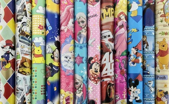 Vijf rollen assortiment Disney cadeaupapier voor kinderen.