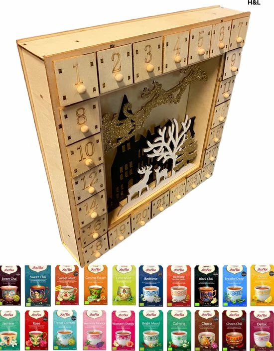 Open elke dag tot aan kerst een vakje met daarin een overheerlijk Yogi theezakje. Deze houten adventskalender is gemakkelijk herbruikbaar. Geef hem cadeau aan iemand anders of aan jezelf. Heb je alle vakjes geopend? Niet getreurd, gebruik de adventskalender dan weer volgend jaar gevuld met jouw favoriete theesmaakjes!