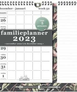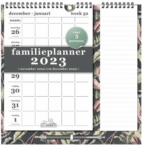 Handige 5 persoons familieplanner met zwart spiraal en metalen hanger op een stevig kartonnen bord. Het dessin is ingetogen: botanische bladeren op een donkere achtergrond. Om nog meer te noteren heeft deze planner een omslag notitielijst en een mooie pen. De indeling van deze planner is één week op 1 pagina. De namen kun je bovenaan invullen. Deze familieplanner loopt van november 2022 t/m december 2023.