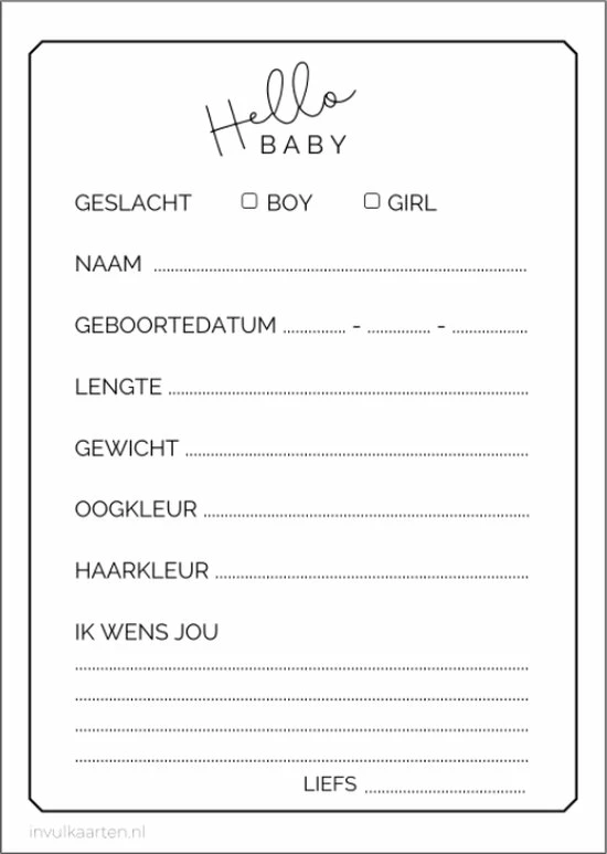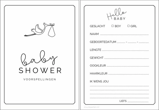Binnenkort een babyshower? Koop deze hippe babyshower invulkaarten. Een hele leuke activiteit om te doen tijdens de babyshower. Alle aanwezigen schrijven hun voorspellingen en een persoonlijke wens voor de baby op deze hippe invulkaarten. Voor de aanstaande mama erg leuk om te lezen en te bewaren voor later. En natuurlijk om te kijken wie de meeste voorspellingen goed had!