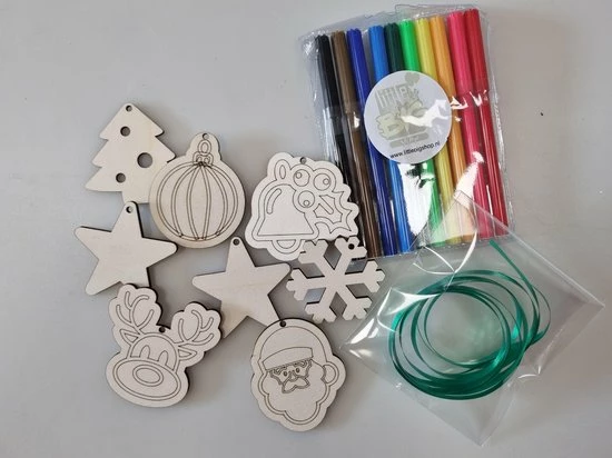 Het knutselpakketje bestaat uit, 8 hangers, lint en 10 viltstiften.