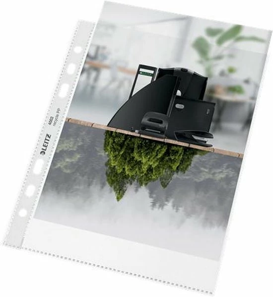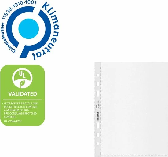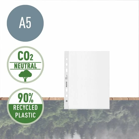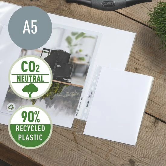 A5 showtas van topkwaliteit voor het onderweg beschermen van documenten en het ordenen van papieren op het werk en thuis. De meervoudig geperforeerde strip zorgt voor het eenvoudig opbergen van documenten in ringbanden en ordners. Gemaakt van 90% (pre-consumer) gerecycled plastic (extern gecontroleerd en gecertificeerd door UL), klimaatneutraal en 100% recyclebaar. Deze sterke en praktische doorzichtige plastic showtas past perfect bij andere producten uit het Leitz Recycle assortiment en is gemaakt om lang mee te gaan. Moderne en eigentijdse ‘groene’ bureau-accessoires die zowel thuis als op kantoor geweldig zal staan. Met de nieuwe milieuvriendelijke Recycle range van Leitz kan je zowel jouw kantooromgeving als het milieu van onze planeet verbeteren.