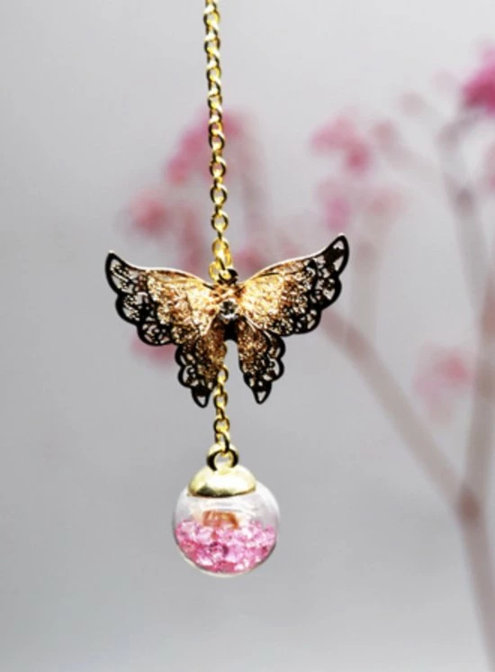 – Afmetingen : Veer 11.3 cm, Ketting 10 cm, Vlinder 3.5 cm, Bloembal 2 cm