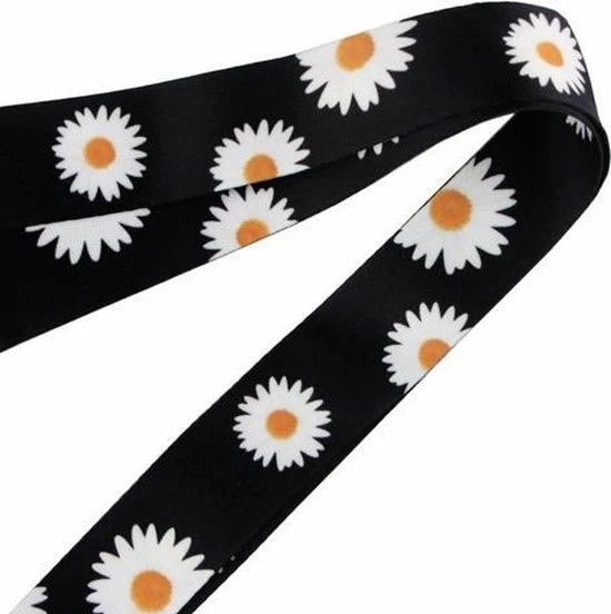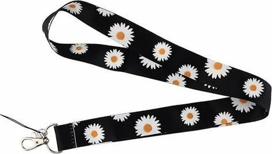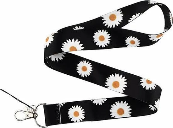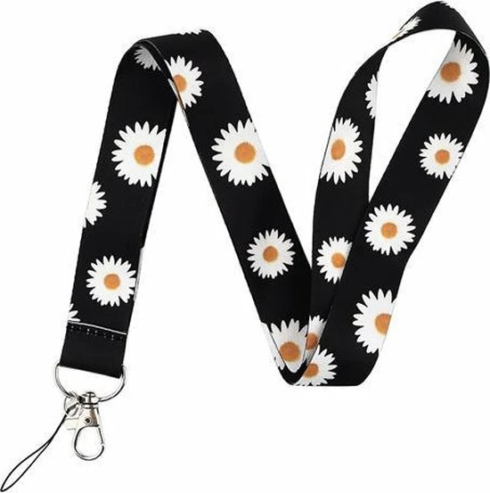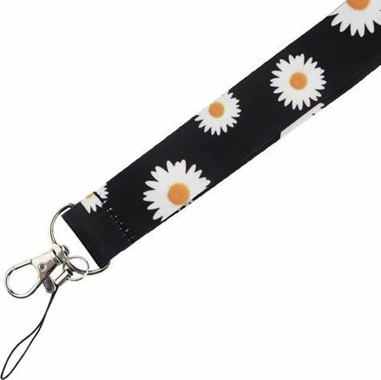 Dit stevige keycord met een trendy print van madeliefjes is voorzien van een metalen haaksluiting en een telefooncord.