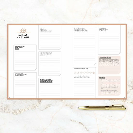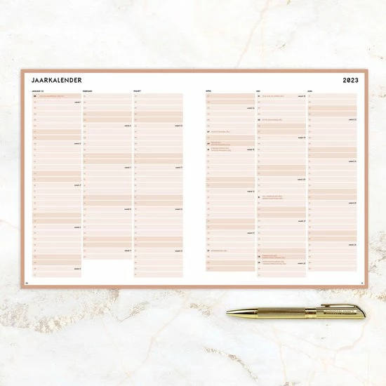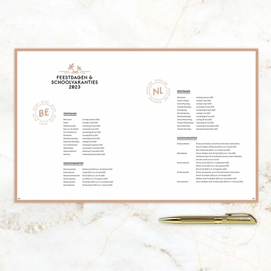 jaaroverzicht met notitieruimte • mijn dromenbord • mijn doelenlijst voor komend jaar • mijn plannen en planningen • maandelijkse reflectievragen • ‘bullet journal pagina’s’ na elke maand (handig om dingen te noteren, creatief te zijn, schema’s te maken, enz.) • feestdagen en schoolvakanties voor België en Nederland • en zóveel meer.