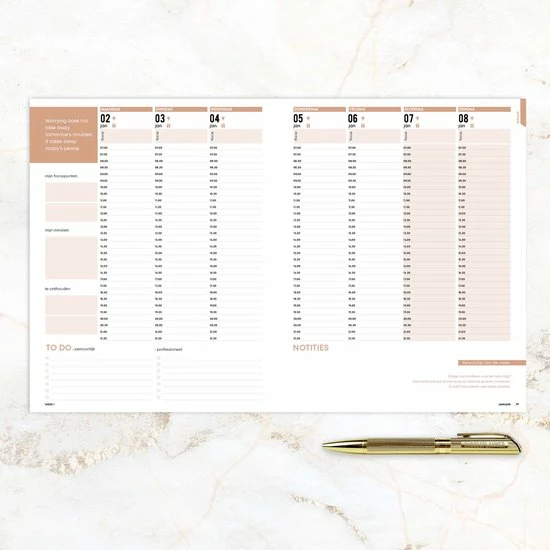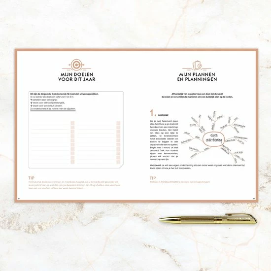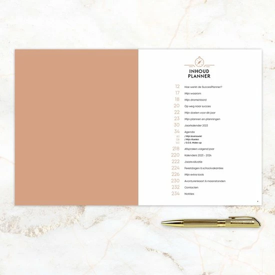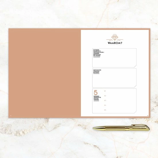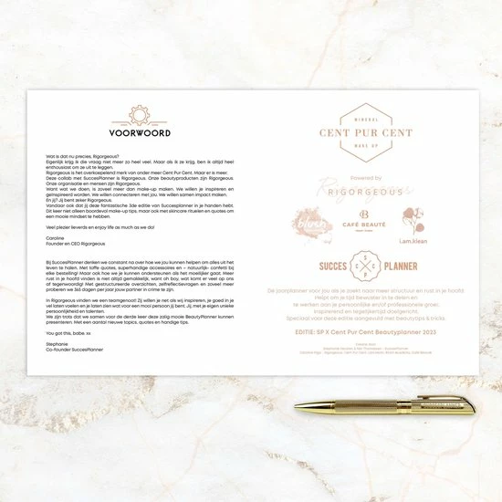 Deze speciale editie combineert niet alleen de kennis van Caroline Rigo en SuccesPlanner, maar ook de looks: We kozen samen voor een nudekleurige kaft met als opdruk pioenen en een rosé-gouden folie, die ook terug te vinden is in de branding van Cent Pur Cent.