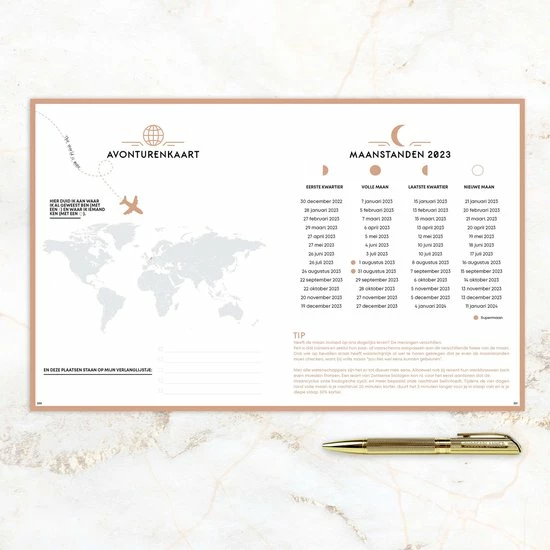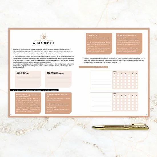 Deze 2023-planner bevat alles wat je van ons gewend bent: een stappenplan van droom naar plan, een overzichtelijke agenda, tools voor meer focus, productiviteit en rust in je hoofd, reflectievragen, … Aangevuld met een resem handigheden op gebied van beauty en make-up. Zoals een wekelijkse make-up tip van een expert, een dossiertje rond rituelen, een beautypaspoort, enz.