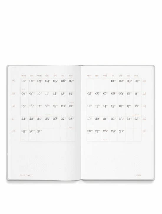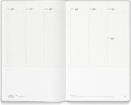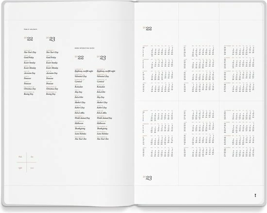 Met deze A4 agenda heb je genoeg ruimte voor al je afspraken en daardoor is hij perfect voor mensen met een eigen praktijk. Het calendarium 2023 hebben we verdeeld in een weekoverzicht, horizontaal verspreid over een spread en een maand overzicht achterin. De pagina’s hebben per maand een ander grid als achtergrond, afgewisseld in wit en zachte fijne pasteltinten.