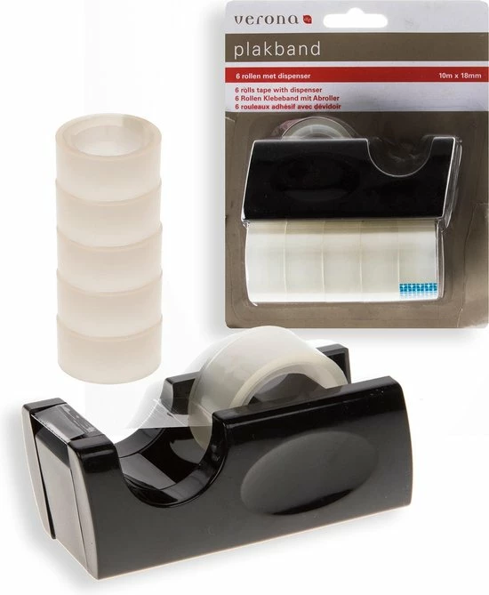 Onmisbaar op elk bureau, in elk kantoor en op welke werkplaats. Een plakbanddispenser met 6 bijgeleverde plakbandrollen.